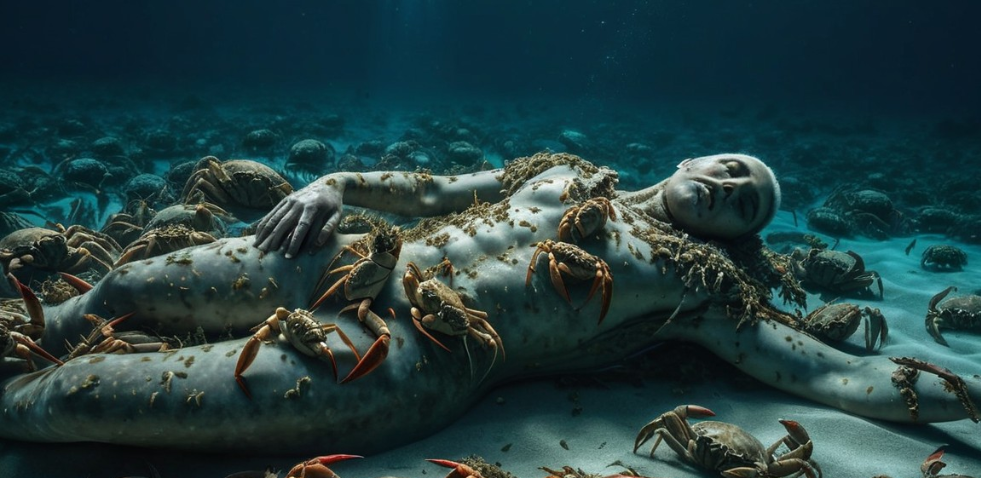 “Aight, he needs a little ballast.” I went to the cabin and returned with this cylindrical statue that came with the boat. It was heavy. I tied a rope to it, and then to Drew’s foot. “Wait, I think we need to make him attractive to the dogfish.” I grabbed the sushi knife and stabbed him a few times. Suddenly, Drew woke up and reached for my leg.